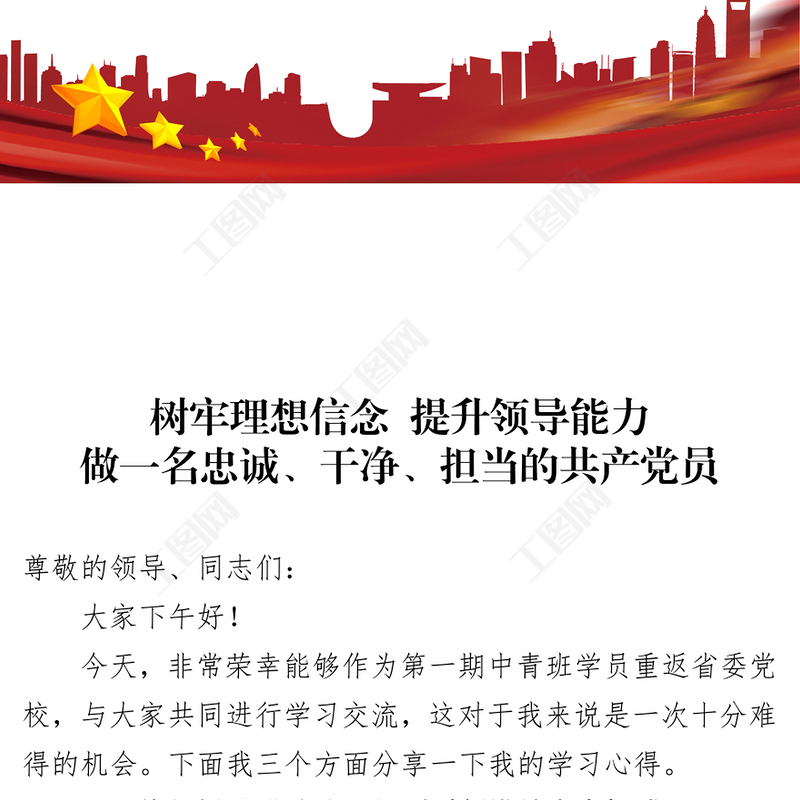 工圖網(wǎng)提供樹牢理想信念提升領(lǐng)導(dǎo)能力做一名忠誠干凈擔(dān)當(dāng)?shù)墓伯a(chǎn)黨員黨員心得體會供會員免費下載。更多精彩黨課PPT素材,盡在工圖網(wǎng)。