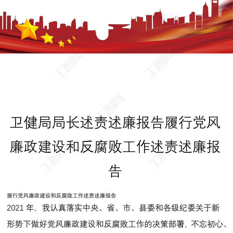 工圖網(wǎng)提供衛(wèi)健局局長述責(zé)述廉報告履行黨風(fēng)廉政建設(shè)和反腐敗工作述責(zé)述廉報告供會員免費下載。更多精彩黨課PPT素材,盡在工圖網(wǎng)。