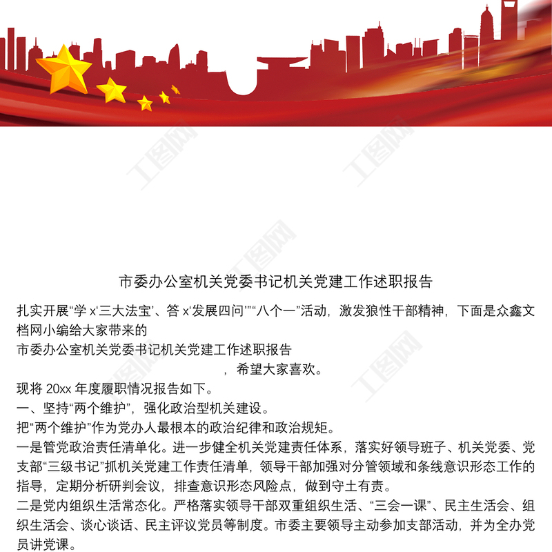 工圖網(wǎng)提供市委辦公室機(jī)關(guān)黨委書記機(jī)關(guān)黨建工作述職報(bào)告供會(huì)員免費(fèi)下載。更多精彩黨課PPT素材,盡在工圖網(wǎng)。