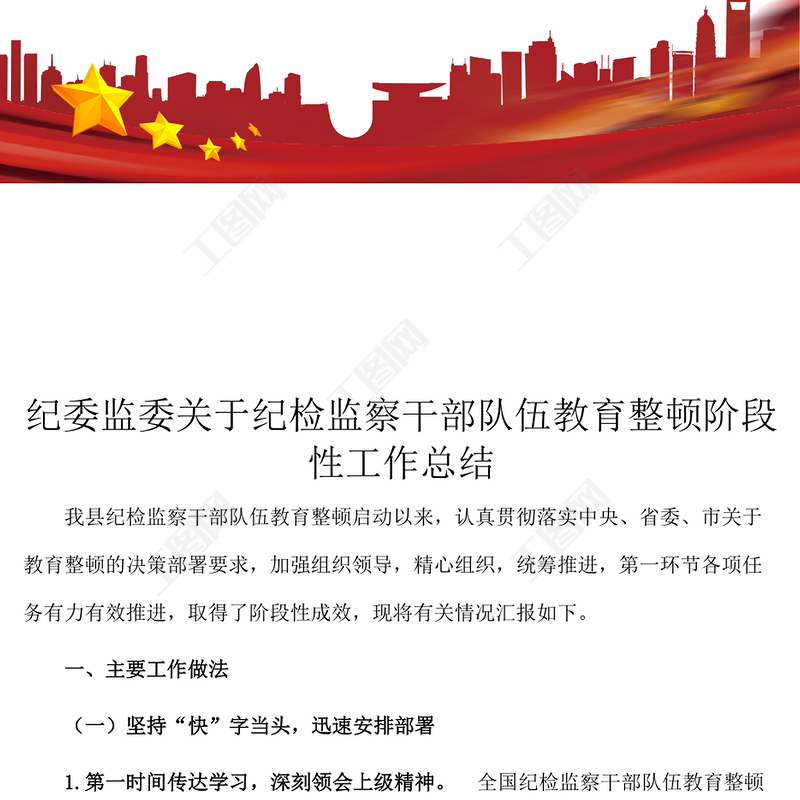 工圖網(wǎng)提供紀(jì)委監(jiān)委關(guān)于紀(jì)檢監(jiān)察干部隊(duì)伍教育整頓階段性工作總結(jié)供會(huì)員免費(fèi)下載。更多精彩黨課PPT素材,盡在工圖網(wǎng)。