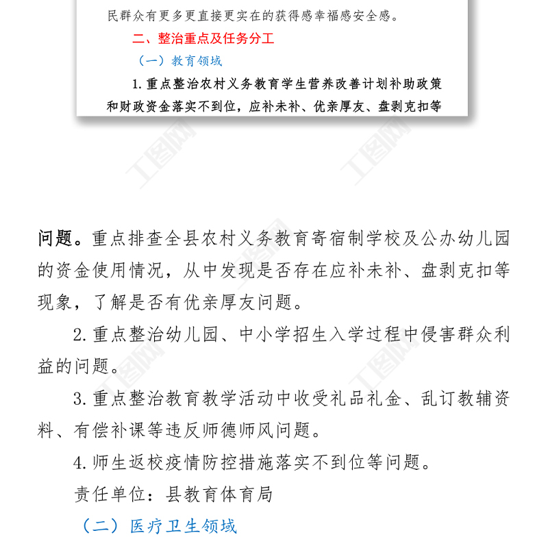 工圖網(wǎng)提供深化民生領(lǐng)域損害群眾利益問題集中整治實(shí)施方案供會(huì)員免費(fèi)下載。更多精彩黨課PPT素材,盡在工圖網(wǎng)。