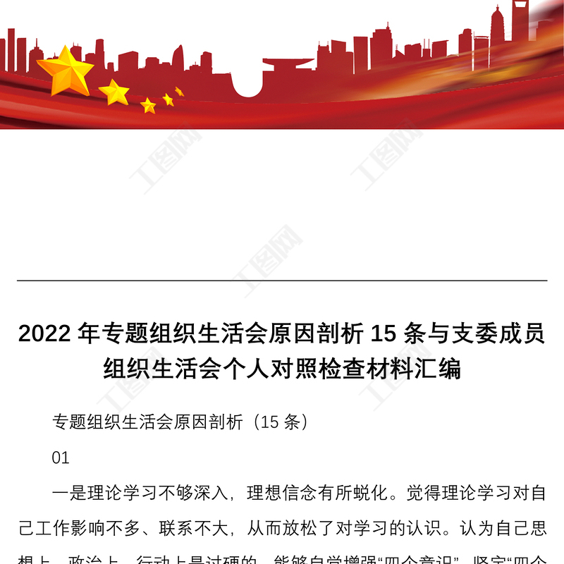 工圖網提供2022年專題組織生活會原因剖析15條與支委成員組織生活會個人對照檢查材料匯編供會員免費下載。更多精彩黨課PPT素材,盡在工圖網。