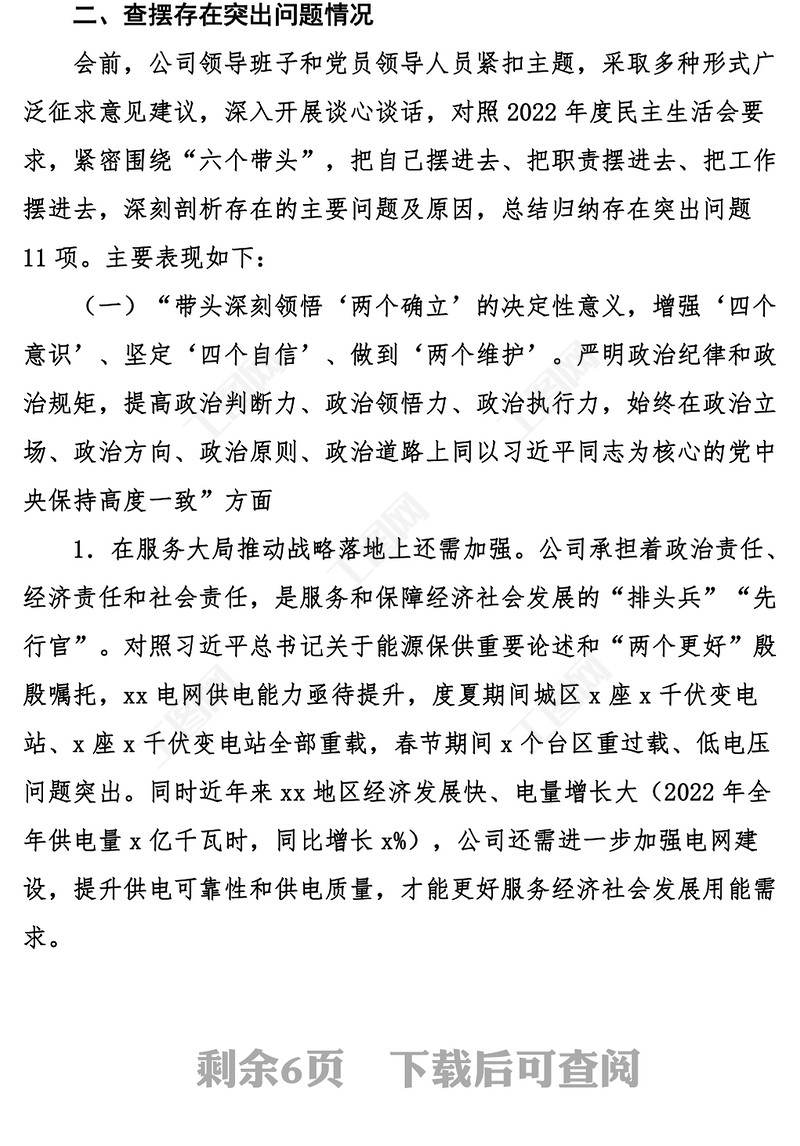 工圖網(wǎng)提供電力公司領(lǐng)導(dǎo)班子2023年六個帶頭民主生活會對照檢查材料供會員免費(fèi)下載。更多精彩黨課PPT素材,盡在工圖網(wǎng)。