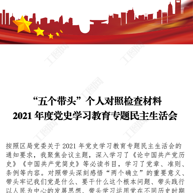 工圖網提供“五個帶頭”個人對照檢查材料2021年度黨史學習教育專題民主生活會專題黨課演講稿供會員免費下載。更多精彩黨課PPT素材,盡在工圖網。