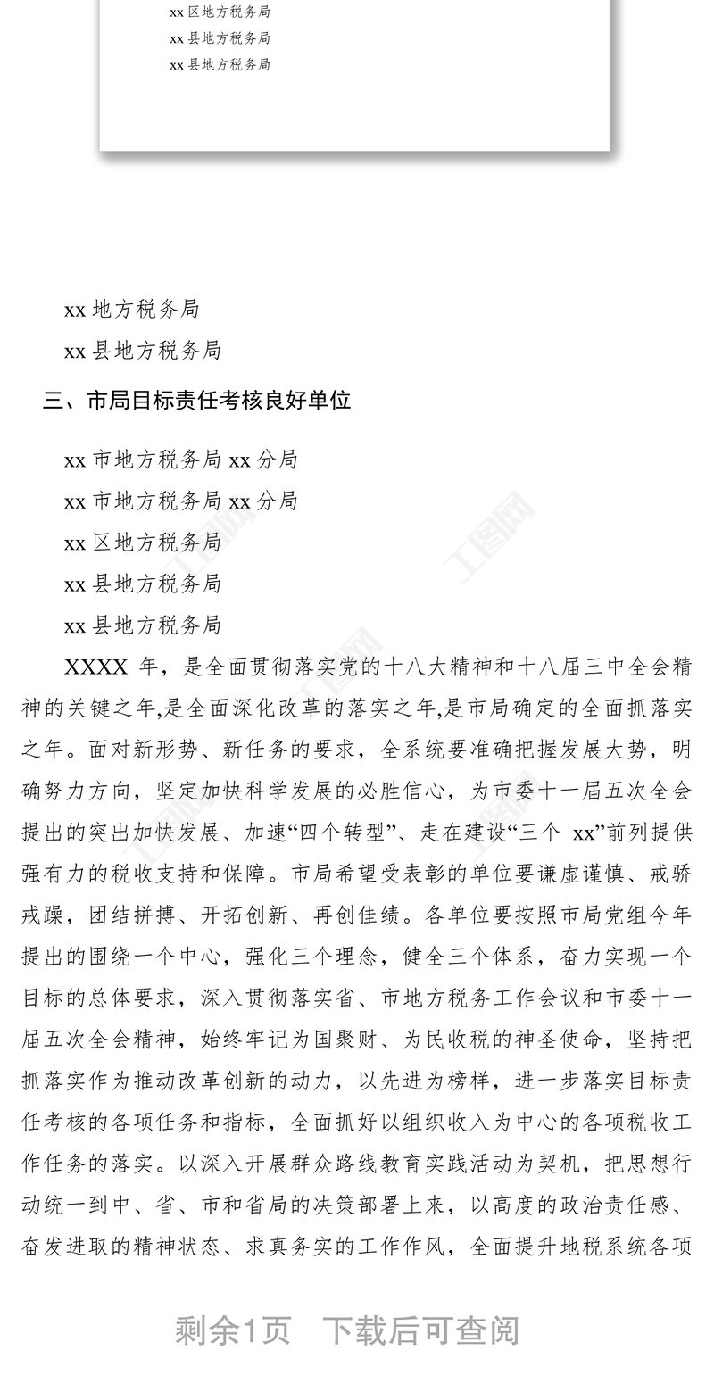 工圖網(wǎng)提供2021xx市地方稅務(wù)局關(guān)于XXXX年度目標(biāo)責(zé)任考核結(jié)果的通報 供會員免費(fèi)下載。更多精彩黨課PPT素材,盡在工圖網(wǎng)。