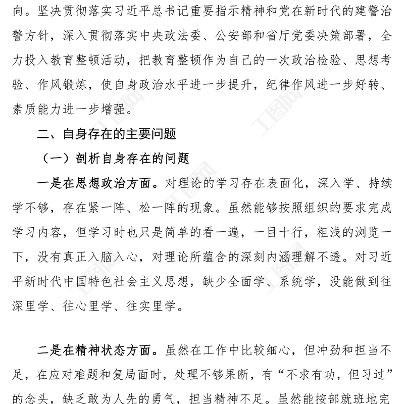 工圖網(wǎng)提供個(gè)人對照檢查公安民警政法隊(duì)伍教育整頓組織生活會(huì)個(gè)人剖析材料范文檢視剖析材料發(fā)言提綱公安局警察干警派出所所長民主生活會(huì)參考供會(huì)員免費(fèi)下載。更多精彩黨課PPT素材,盡在工圖網(wǎng)。