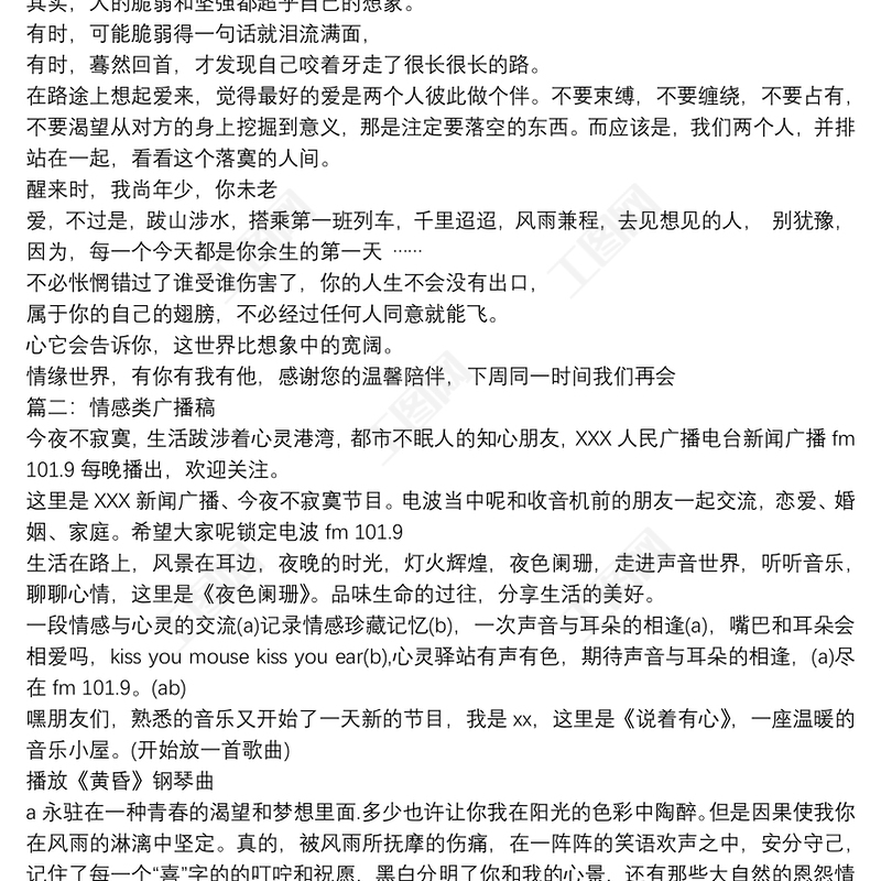 工圖網(wǎng)提供2021情感電臺廣播稿范文(共9篇)供會員免費下載。更多精彩黨課PPT素材,盡在工圖網(wǎng)。