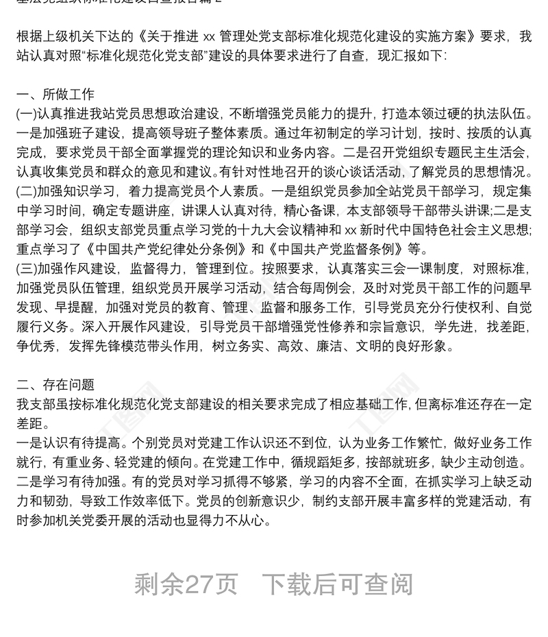 工圖網(wǎng)提供【基層黨組織標(biāo)準(zhǔn)化規(guī)范化建設(shè)自查報(bào)告】基層黨組織標(biāo)準(zhǔn)化建設(shè)自查報(bào)告20篇供會(huì)員免費(fèi)下載。更多精彩黨課PPT素材,盡在工圖網(wǎng)。