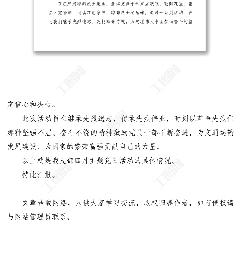 工圖網(wǎng)提供2021【計(jì)劃總結(jié)】交通運(yùn)輸局機(jī)關(guān)支部四月主題黨日活動(dòng)情況匯報(bào)供會(huì)員免費(fèi)下載。更多精彩黨課PPT素材,盡在工圖網(wǎng)。