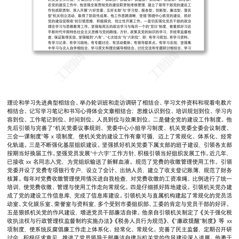 工圖網(wǎng)提供稅務(wù)局優(yōu)秀黨務(wù)工作者先進(jìn)事跡材料供會(huì)員免費(fèi)下載。更多精彩黨課PPT素材,盡在工圖網(wǎng)。