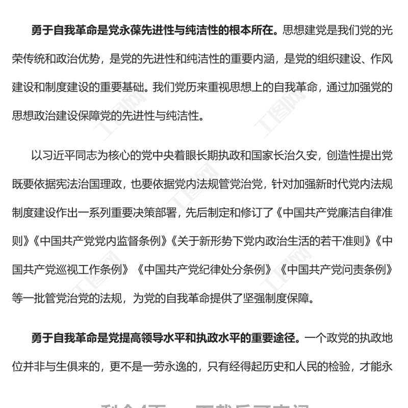 工圖網(wǎng)提供勇于自我革命持續(xù)推進(jìn)新時(shí)代黨的建設(shè)黨員干部學(xué)習(xí)教育專題黨課供會(huì)員免費(fèi)下載。更多精彩黨課PPT素材,盡在工圖網(wǎng)。