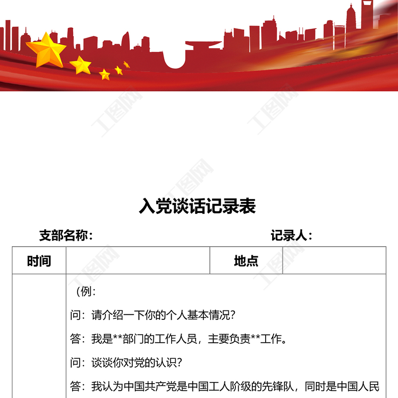 工圖網(wǎng)提供2021年入黨談話記錄表供會員免費下載。更多精彩黨課PPT素材,盡在工圖網(wǎng)。