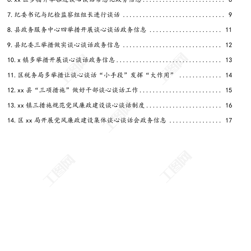 工圖網(wǎng)提供經(jīng)典談心談話政務(wù)信息匯編(14篇)供會員免費(fèi)下載。更多精彩黨課PPT素材,盡在工圖網(wǎng)。