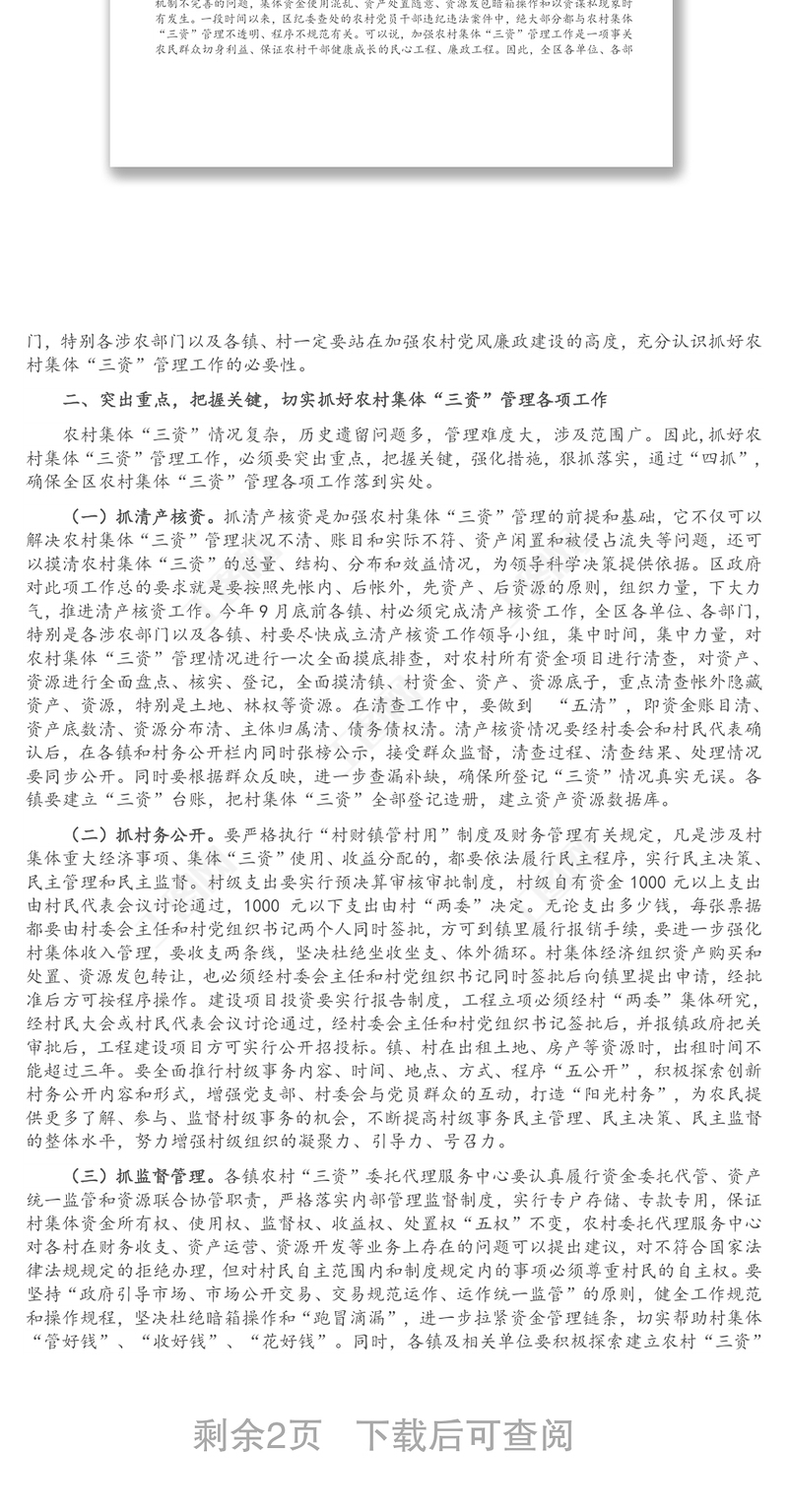 在區(qū)農(nóng)村集體“三資”管理工作推進會議上的講話,工作推進會,公文范文 Array