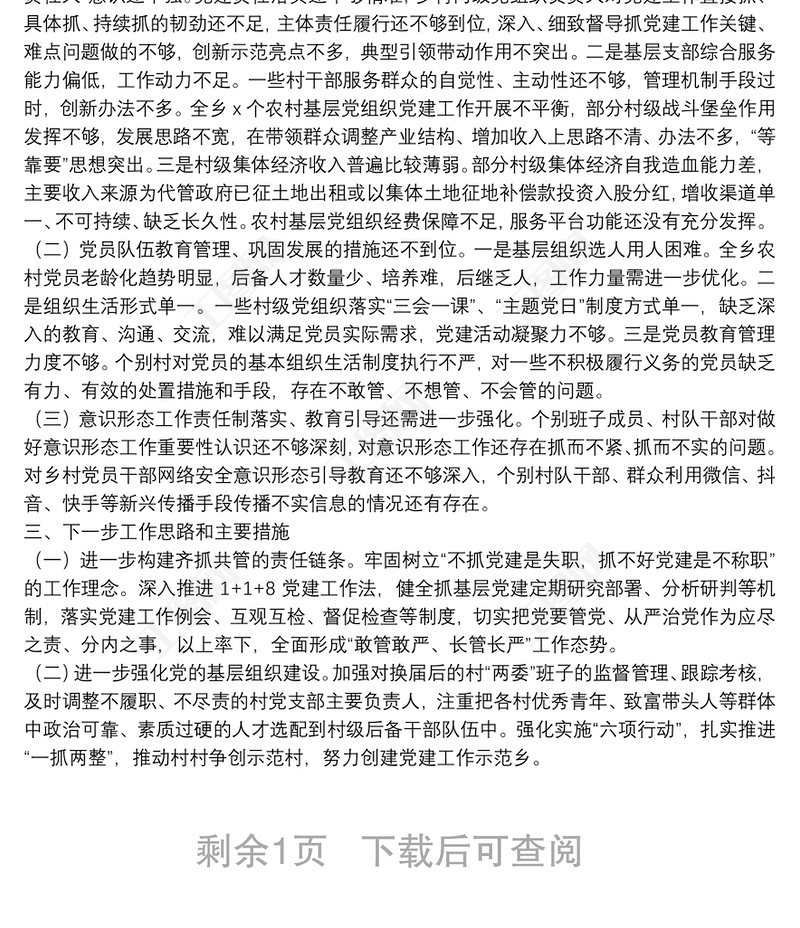 2021一崗雙責(zé)抓黨建工作情況匯報(bào)2021鄉(xiāng)鎮(zhèn)紀(jì)委書記黨史教育學(xué)習(xí)民主生活會(huì)對(duì)照檢查材料2021鄉(xiāng)鎮(zhèn)紀(jì)委書記黨史學(xué)習(xí)教育黨課材料2022公司關(guān)于推進(jìn)基層黨建三基本建設(shè)與三基工作有機(jī)融合的實(shí)施方案2021鄉(xiāng)鎮(zhèn)黨委書記組織生活會(huì)剖析材料村委會(huì)抓基層黨建工作述職報(bào)告2022年最新2022黨委書記黨風(fēng)廉政建設(shè)述職報(bào)告2022抓基層黨建和人才工作述職報(bào)告2021鄉(xiāng)鎮(zhèn)黨委書記對(duì)縣紀(jì)委提工作建議2023抓基層黨建工作總結(jié)2024總結(jié)上報(bào)機(jī)關(guān)黨建工作情況