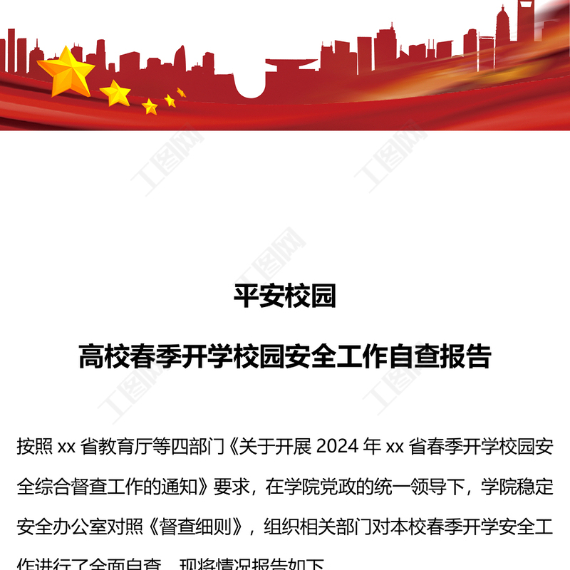 工圖網(wǎng)提供高校春季開學(xué)校園安全工作自查報(bào)告PPT簡潔大氣平安校園建設(shè)課件模板(講稿)供會員免費(fèi)下載。更多精彩黨課PPT素材,盡在工圖網(wǎng)。