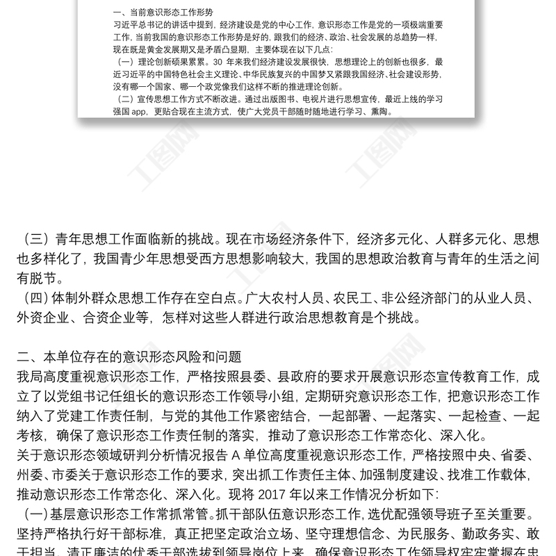工圖網(wǎng)提供意識(shí)形態(tài)領(lǐng)域形勢(shì)分析研判報(bào)告某局意識(shí)形態(tài)領(lǐng)域分析研判報(bào)告供會(huì)員免費(fèi)下載。更多精彩黨課PPT素材,盡在工圖網(wǎng)。