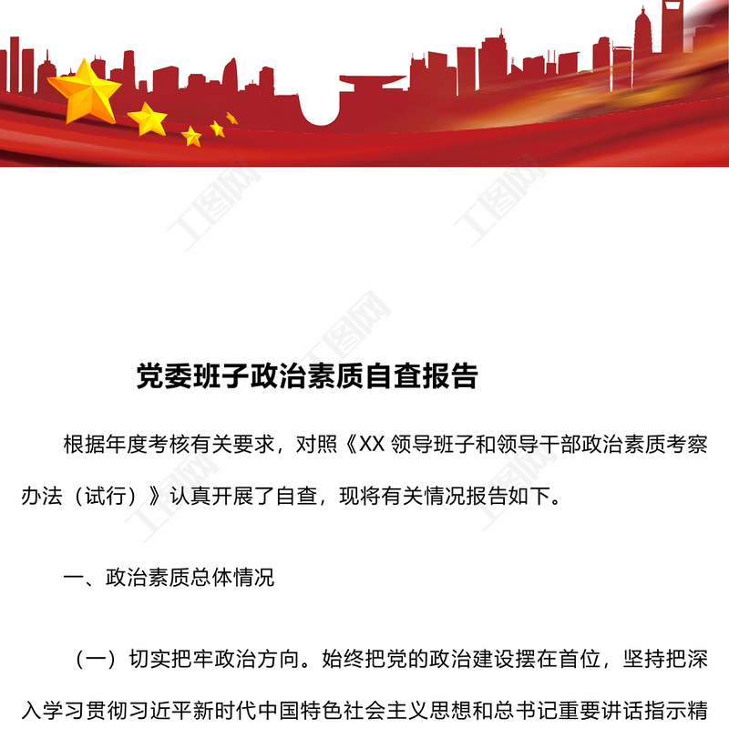 工圖網(wǎng)提供黨委班子政治素質自査報告范文供會員免費下載。更多精彩黨課PPT素材,盡在工圖網(wǎng)。