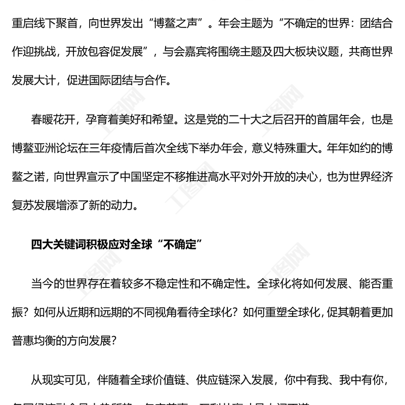工圖網(wǎng)提供2023以團(tuán)結(jié)合作應(yīng)對不確定的世界PPT精美大氣風(fēng)寫在博鰲亞洲論壇2023年年會(huì)之際專題黨課課件(講稿)供會(huì)員免費(fèi)下載。更多精彩黨課PPT素材,盡在工圖網(wǎng)。