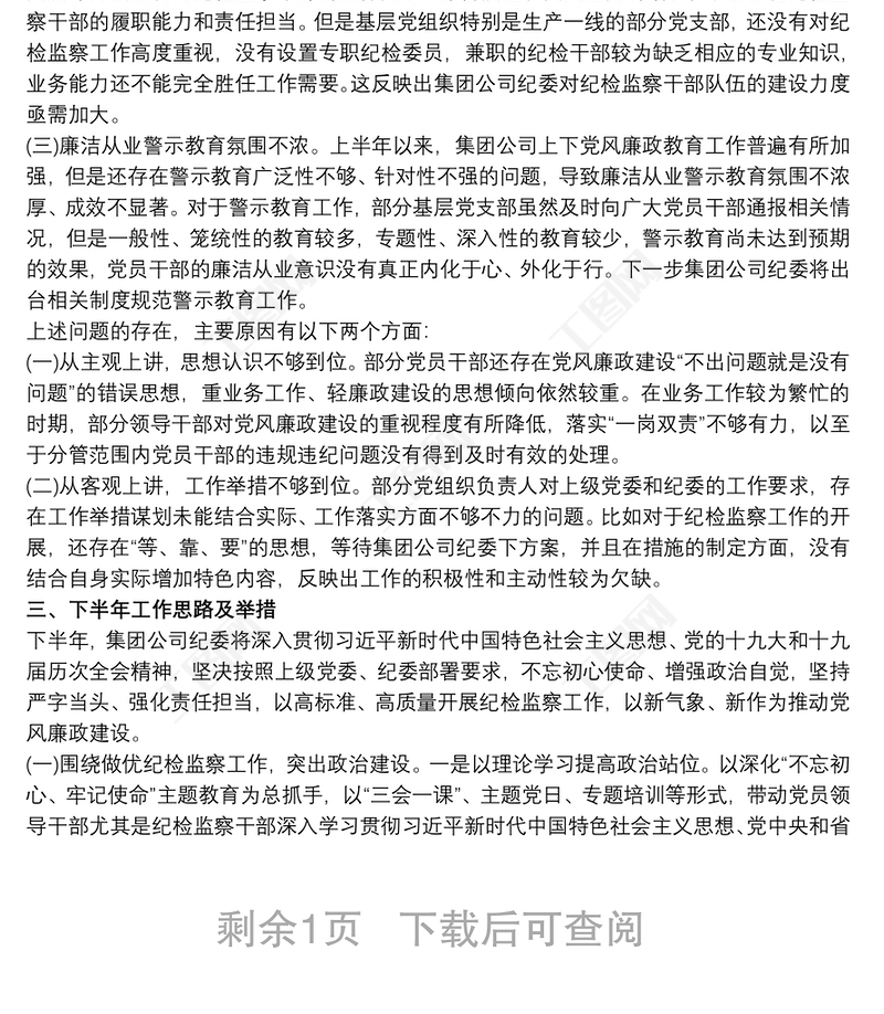上半年國(guó)有企業(yè)紀(jì)檢監(jiān)察工作總結(jié)及下半年工作計(jì)劃