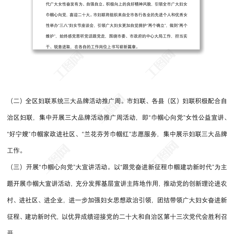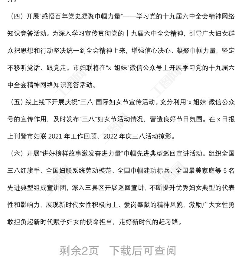 工圖網(wǎng)提供市婦聯(lián)2022年“三八”婦女節(jié)活動(dòng)工作方案供會(huì)員免費(fèi)下載。更多精彩黨課PPT素材,盡在工圖網(wǎng)。