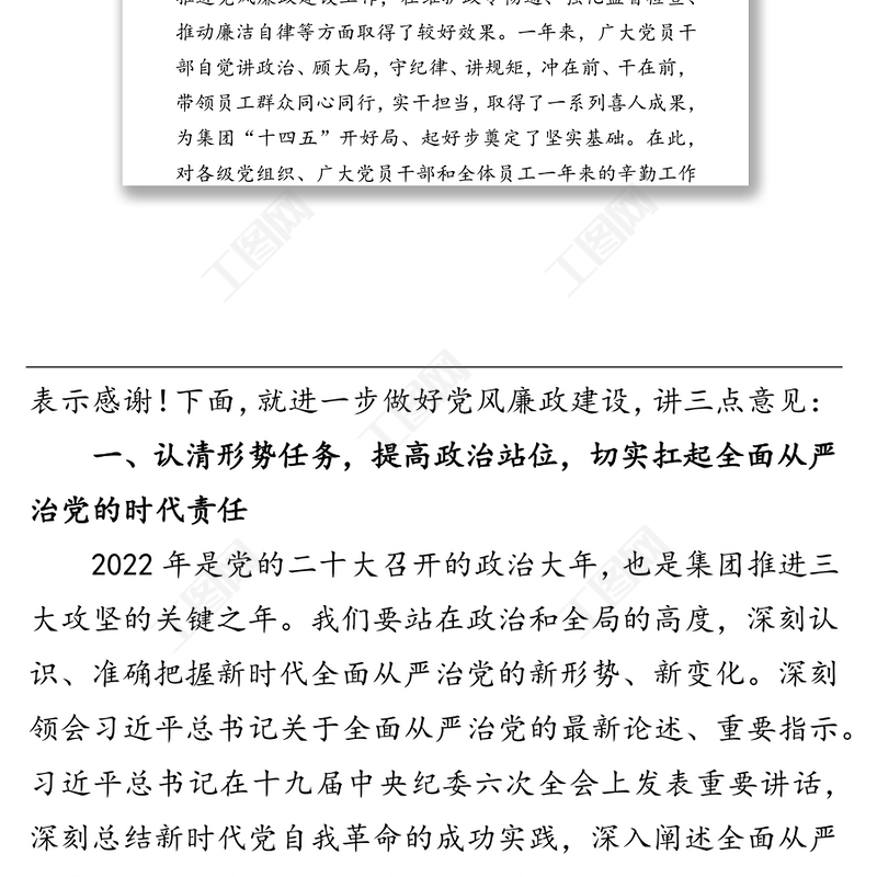 工圖網(wǎng)提供2022年國企黨委書記在黨風(fēng)廉政建設(shè)工作會議上的講話供會員免費(fèi)下載。更多精彩黨課PPT素材,盡在工圖網(wǎng)。
