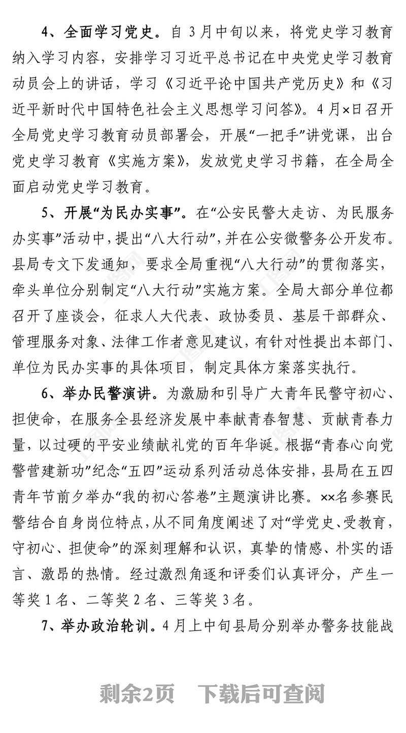2021學(xué)黨史工作情況匯報(bào)2021建黨100周年工作情況匯報(bào)2021第二批政法隊(duì)伍教育整頓工作總結(jié)2021檢察隊(duì)伍教育整頓組織生活會(huì)對(duì)照檢查材料2021公安隊(duì)伍教育整頓組織生活會(huì)個(gè)人剖析材料2021政法隊(duì)伍教育整頓發(fā)聲亮劍材料2021隊(duì)伍教育整頓專題組織生活會(huì)對(duì)照檢查材料公安隊(duì)伍教育整頓黨課講稿2021年幼兒園黨史教育工作進(jìn)展情況匯報(bào)2021年上半年全面從嚴(yán)治黨工作情況匯報(bào)2021社區(qū)黨史教育工作進(jìn)展情況匯報(bào)2022縣清廉醫(yī)院建設(shè)工作情況匯報(bào)