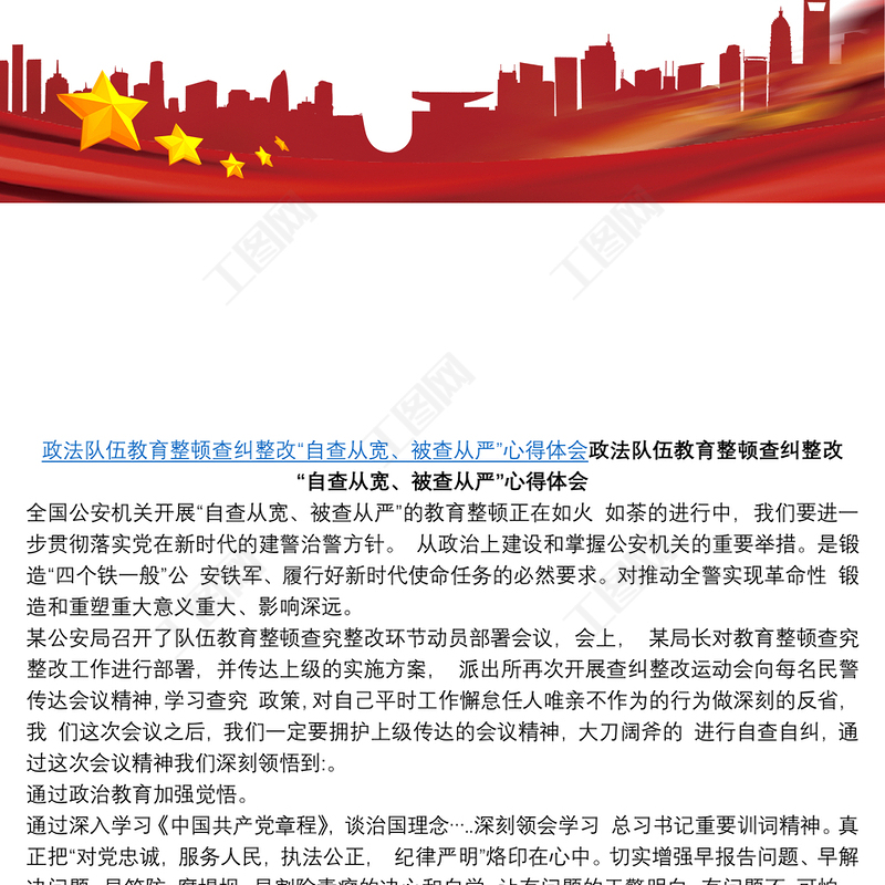工圖網(wǎng)提供政法隊(duì)伍教育整頓查糾整改“自查從寬、被查從嚴(yán)”心得體會(huì)供會(huì)員免費(fèi)下載。更多精彩黨課PPT素材,盡在工圖網(wǎng)。