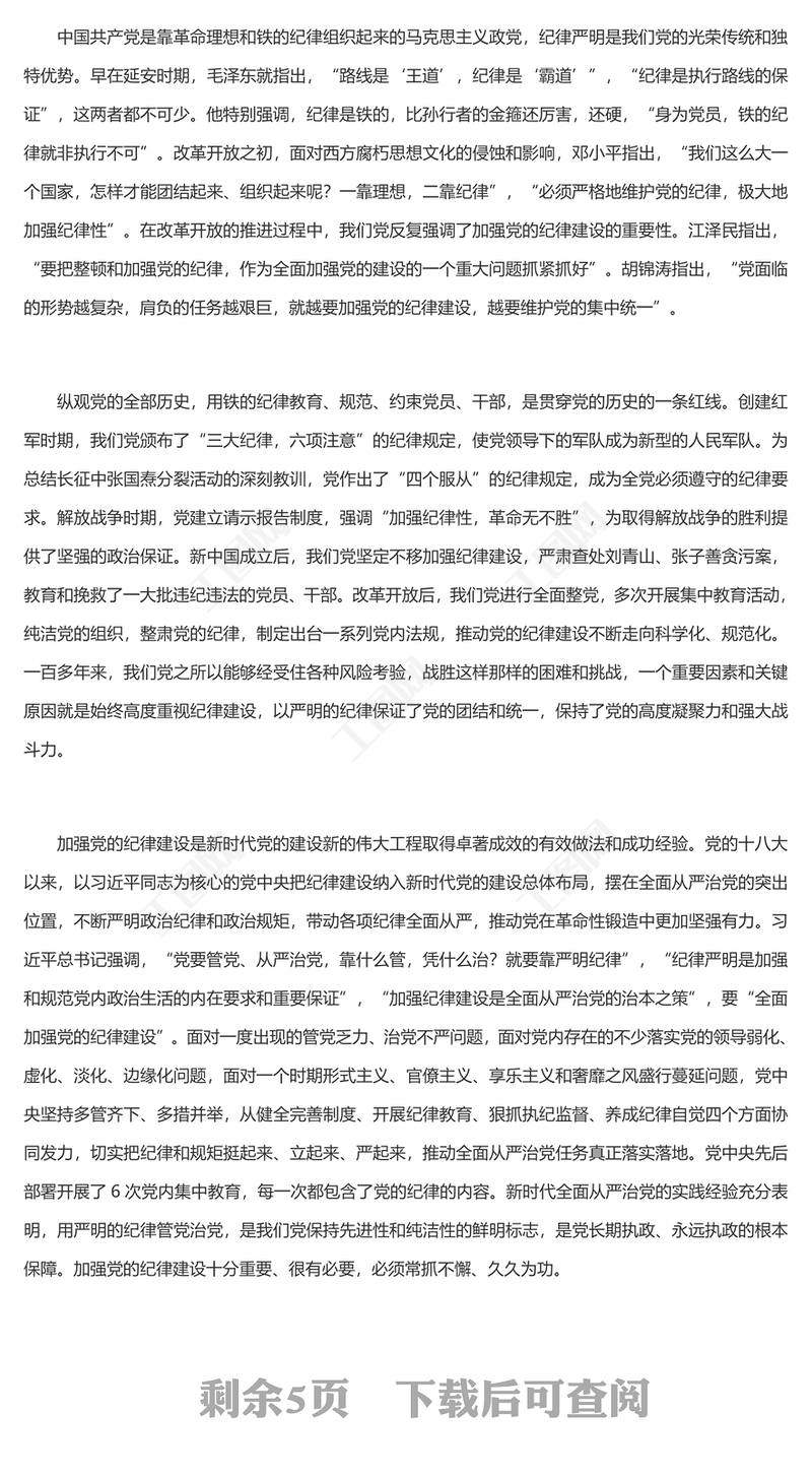 > 黨課講稿 > 推進(jìn)黨的偉大事業(yè)提供堅(jiān)強(qiáng)紀(jì)律保證PPT簡約風(fēng)全黨開展黨紀(jì)學(xué)習(xí)教育工作課件模板(講稿).DOCX 【圖片、文字、動(dòng)畫均可編輯】