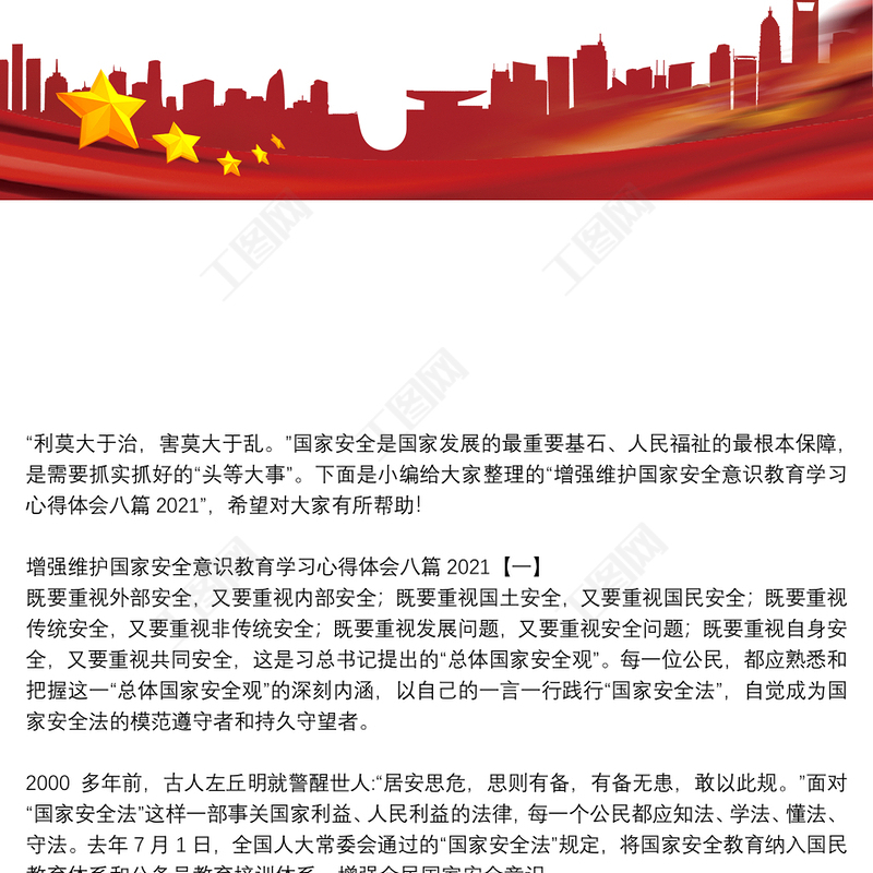 工圖網(wǎng)提供增強維護國家安全意識教育學習心得體會八篇2021供會員免費下載。更多精彩黨課PPT素材,盡在工圖網(wǎng)。