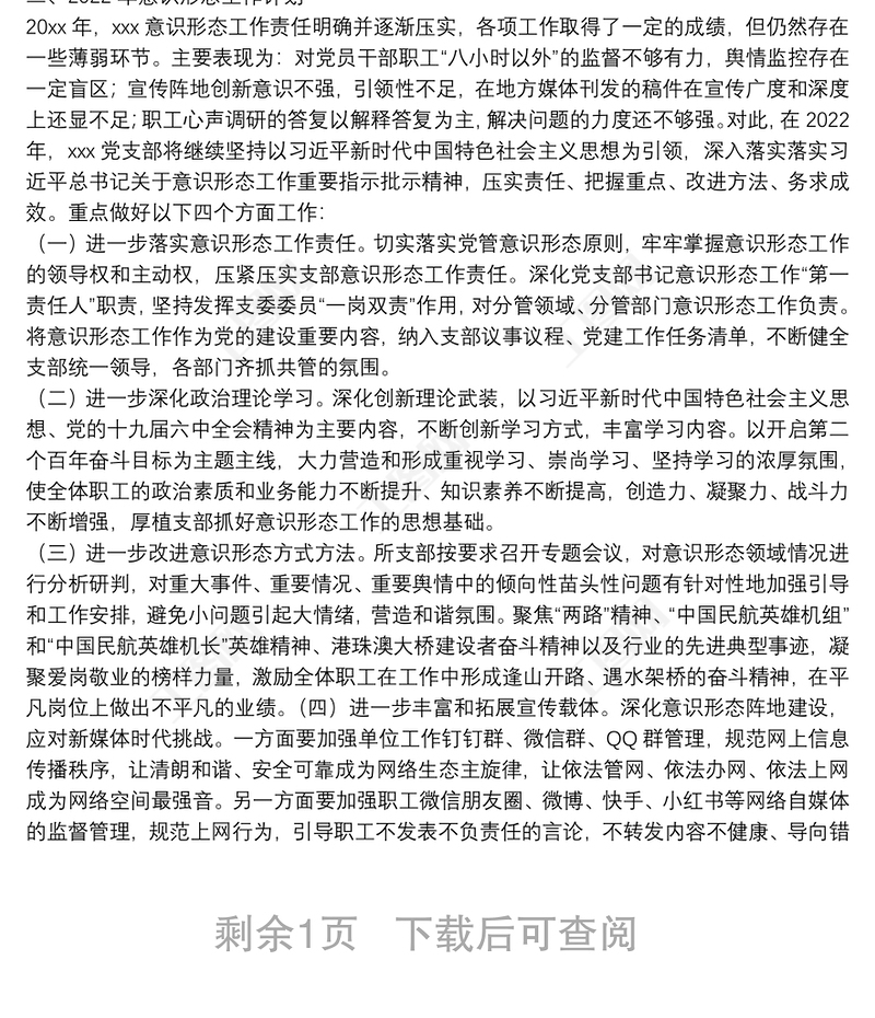 2022意識(shí)形態(tài)工作研判報(bào)告2021黨支部書記意識(shí)形態(tài)工作述職報(bào)告意識(shí)形態(tài)工作調(diào)研報(bào)告2022年2021網(wǎng)絡(luò)意識(shí)形態(tài)工作分析研判報(bào)告2022融媒體中心意識(shí)形態(tài)工作總結(jié)2022黨支部年度意識(shí)形態(tài)工作報(bào)告中學(xué)2021年意識(shí)形態(tài)工作總結(jié)2022意識(shí)形態(tài)工作措施不夠深入的原因2022老干部意識(shí)形態(tài)工作風(fēng)險(xiǎn)點(diǎn)排查報(bào)告2022關(guān)于審議意識(shí)形態(tài)工作報(bào)告的請(qǐng)示2021車隊(duì)意識(shí)形態(tài)工作總結(jié)2023銀行意識(shí)形態(tài)工作研判報(bào)告社區(qū)2021年上半年意識(shí)形態(tài)工作總結(jié)2021二級(jí)學(xué)院意識(shí)形態(tài)工作自查報(bào)告消防大隊(duì)2021年意識(shí)形態(tài)工作總結(jié)2022年第二季度意識(shí)形態(tài)工作報(bào)告