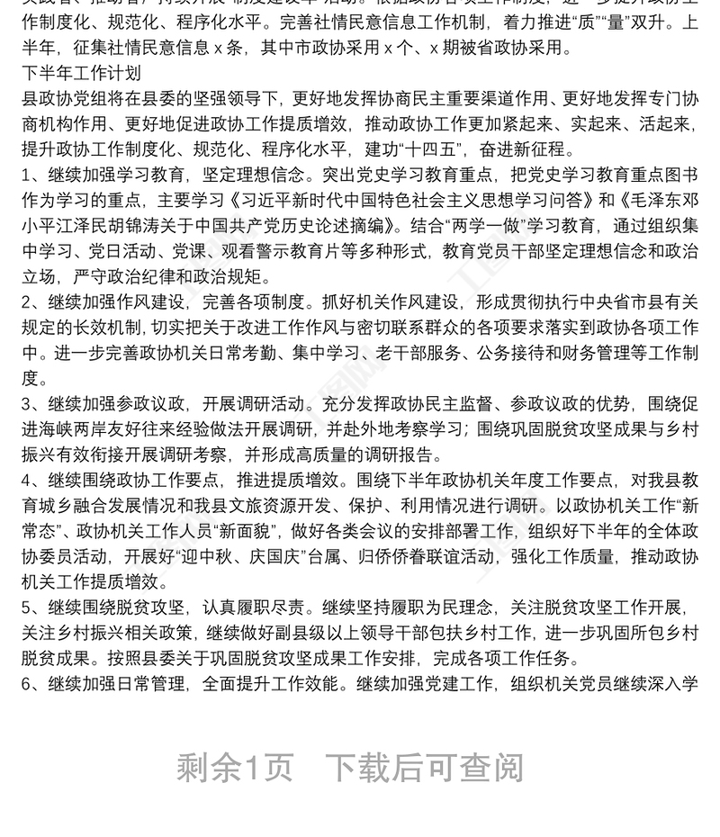 X縣政協(xié)2021年上半年工作總結(jié)及下半年工作安排