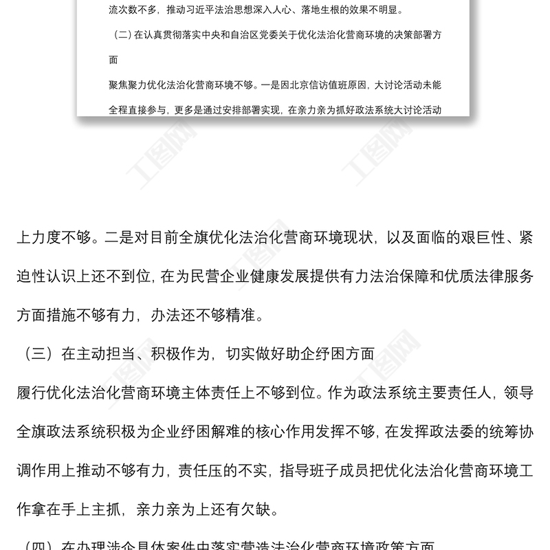 工圖網(wǎng)提供政法機(jī)關(guān)“優(yōu)化法治化營商環(huán)境、服務(wù)保障高質(zhì)量發(fā)展”大討論活動對照檢視材料發(fā)言供會員免費(fèi)下載。更多精彩黨課PPT素材,盡在工圖網(wǎng)。