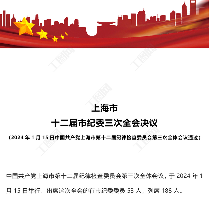 工圖網(wǎng)提供上海市十二屆市紀(jì)委三次全會(huì)決議PPT紅色精美回顧2023年紀(jì)檢監(jiān)察工作部署2024年任務(wù)課件(講稿)供會(huì)員免費(fèi)下載。更多精彩黨課PPT素材,盡在工圖網(wǎng)。