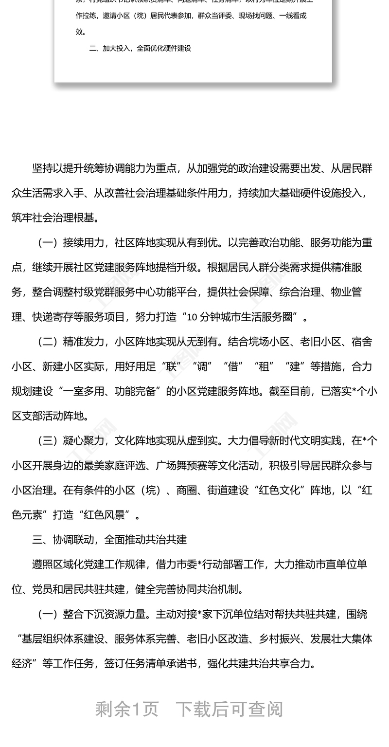 黨建引領(lǐng)基層社會(huì)治理黨課講稿2022有事好商量工作經(jīng)驗(yàn)交流材料2022黨建引領(lǐng)基層社會(huì)治理講稿講稿在全市平安建設(shè)工作經(jīng)驗(yàn)交流會(huì)上的發(fā)言材料20212022黨建引領(lǐng)信用村建設(shè)發(fā)言材料2021黨建引領(lǐng)提質(zhì)增效金句發(fā)言材料2021黨建引領(lǐng)退役軍人事務(wù)工作亮點(diǎn)發(fā)言材料2021提高政治站位加強(qiáng)黨建引領(lǐng)發(fā)言材料2021黨建引領(lǐng)信用村試點(diǎn)發(fā)言材料2021黨建引領(lǐng)的村改居社會(huì)工作總結(jié)2023黨建引領(lǐng)的下一步工作計(jì)劃2021基層黨建專(zhuān)項(xiàng)整治工作推進(jìn)會(huì)發(fā)言材料2023醫(yī)院黨建引領(lǐng)示范行動(dòng)方案2023黨建引領(lǐng)特色材料2023做基層黨建工作的經(jīng)驗(yàn)總結(jié)