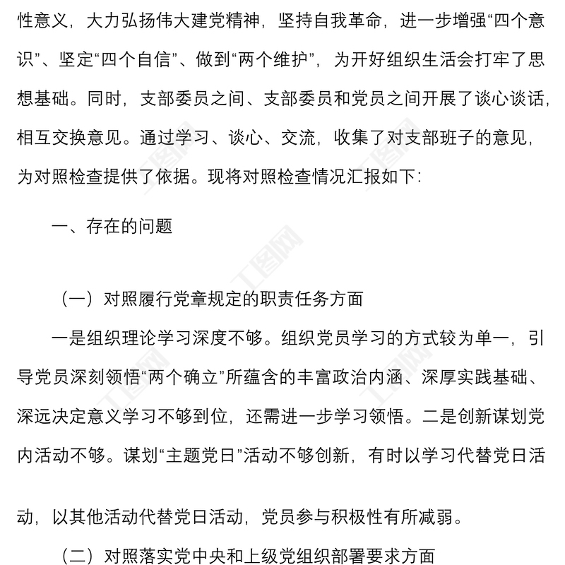 工圖網(wǎng)提供2021年度組織生活會黨支部班子對照檢查材料范文(四個對照)供會員免費下載。更多精彩黨課PPT素材,盡在工圖網(wǎng)。