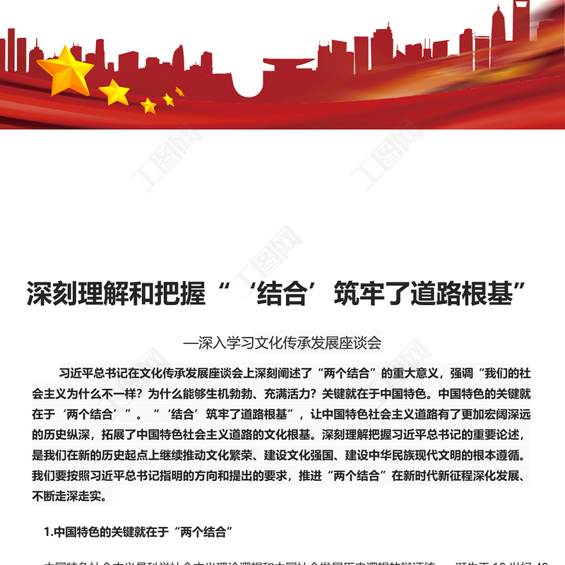 工圖網(wǎng)提供深刻理解和把握“‘結(jié)合’筑牢了道路根基”PPT紅色黨政風(fēng)深入學(xué)習(xí)文化傳承發(fā)展座談會(huì)專題課件模板下載(講稿)供會(huì)員免費(fèi)下載。更多精彩黨課PPT素材,盡在工圖網(wǎng)。