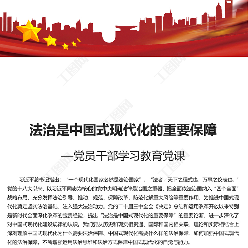 工圖網(wǎng)提供法治是中國式現(xiàn)代化的重要保障PPT紅色黨建風(fēng)黨員干部學(xué)習(xí)教育黨課(講稿)供會(huì)員免費(fèi)下載。更多精彩黨課PPT素材,盡在工圖網(wǎng)。