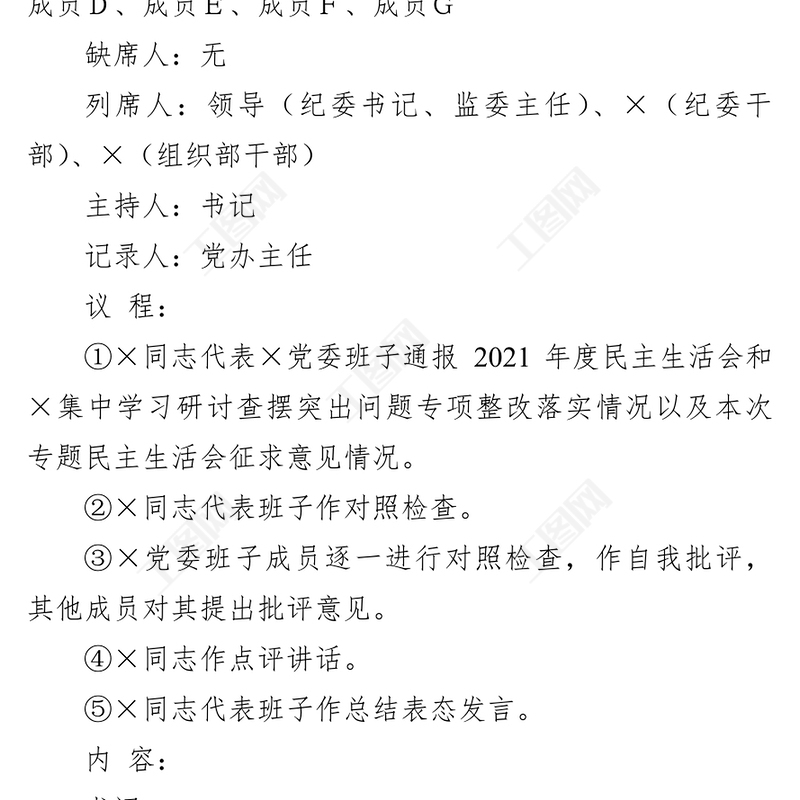 工圖網(wǎng)提供黨委班子學(xué)習(xí)教育專題民主生活會(huì)會(huì)議記錄供會(huì)員免費(fèi)下載。更多精彩黨課PPT素材,盡在工圖網(wǎng)。