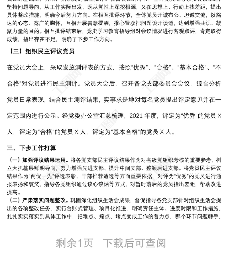 X市委關(guān)于組織所屬黨支部召開2021年組織生活會和開展民主評議黨員情況報(bào)告