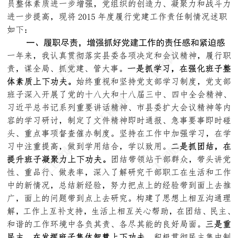 首頁(yè) > WORD文檔 > 述職報(bào)告 > 鄯善縣xxx黨支部書(shū)記2015年落實(shí)黨建工作責(zé)任制述職報(bào)告.DOCX 【圖片、文字、動(dòng)畫(huà)均可編輯】