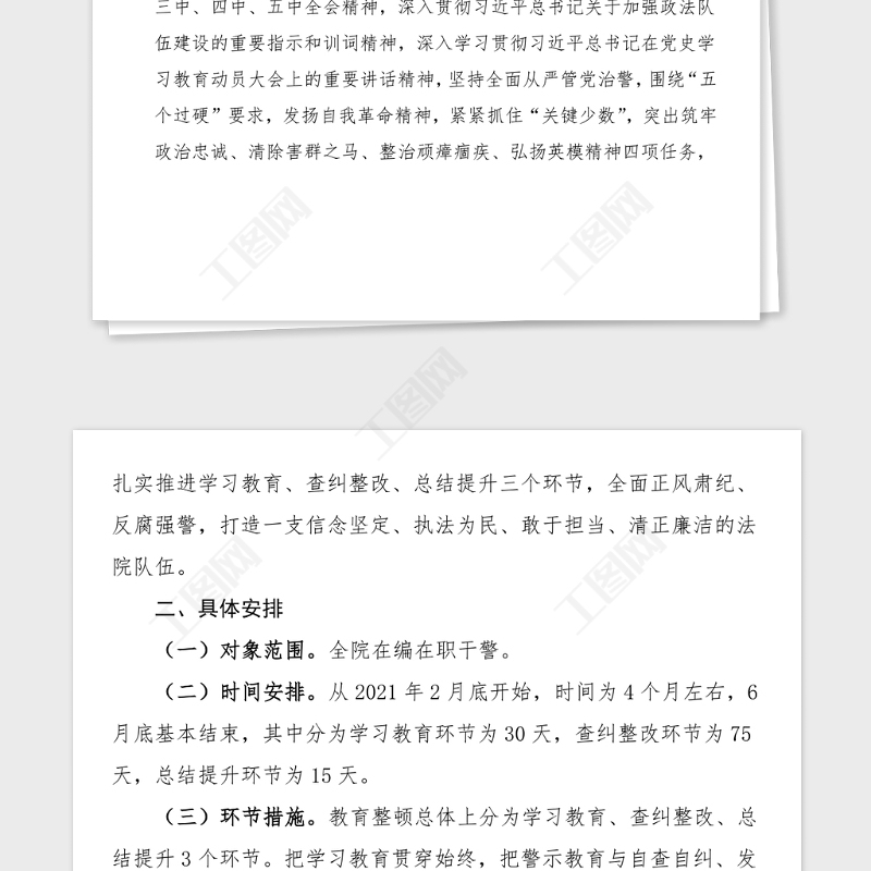 工圖網(wǎng)提供法院開展政法隊伍教育整頓工作實施方案范文工作方案供會員免費下載。更多精彩黨課PPT素材,盡在工圖網(wǎng)。
