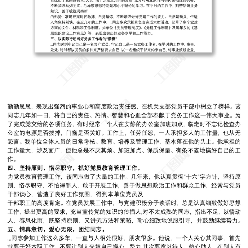 工圖網(wǎng)提供[優(yōu)秀黨務(wù)工作者推薦材料]優(yōu)秀黨務(wù)工作者材料供會員免費(fèi)下載。更多精彩黨課PPT素材,盡在工圖網(wǎng)。