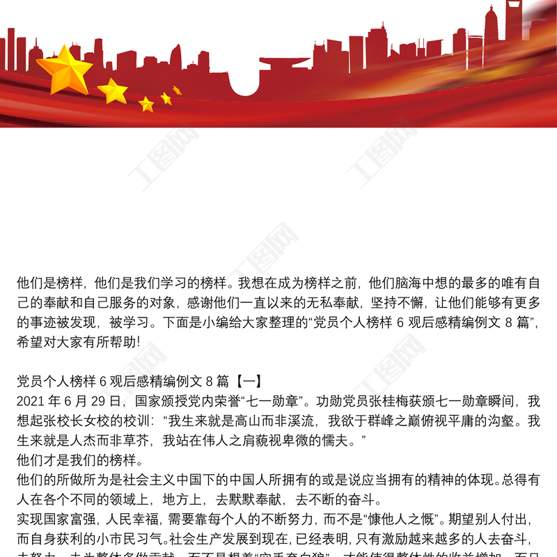 工圖網(wǎng)提供黨員個(gè)人榜樣6觀后感精編例文8篇供會(huì)員免費(fèi)下載。更多精彩黨課PPT素材,盡在工圖網(wǎng)。
