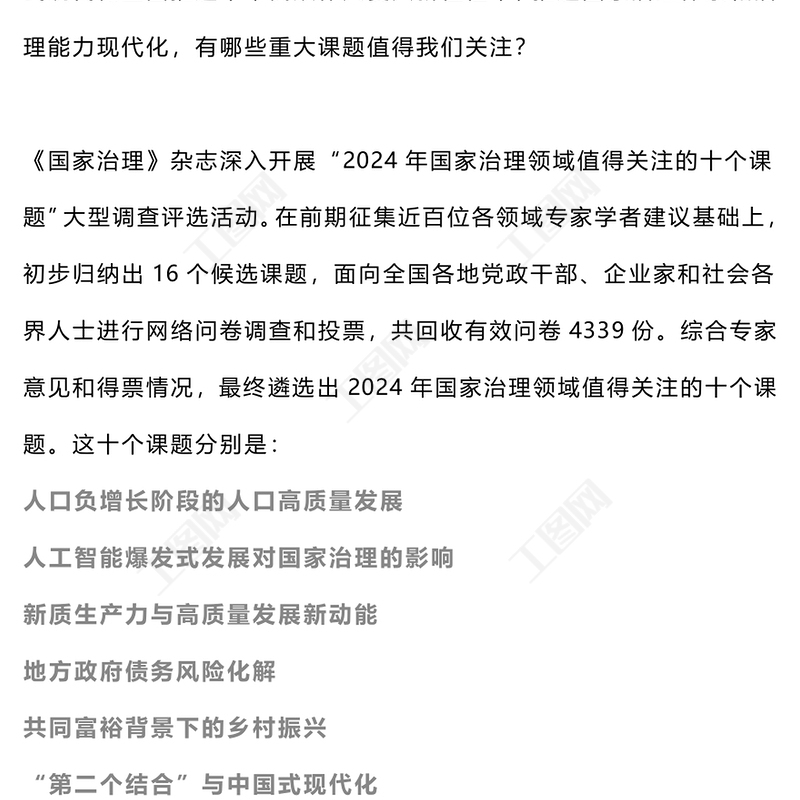 工圖網(wǎng)提供2024年國(guó)家治理領(lǐng)域值得關(guān)注的十個(gè)課題PPT課件(講稿)供會(huì)員免費(fèi)下載。更多精彩黨課PPT素材,盡在工圖網(wǎng)。