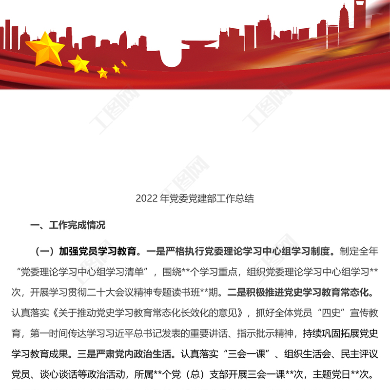 工圖網(wǎng)提供2022年黨委黨建部工作總結(jié)供會(huì)員免費(fèi)下載。更多精彩黨課PPT素材,盡在工圖網(wǎng)。