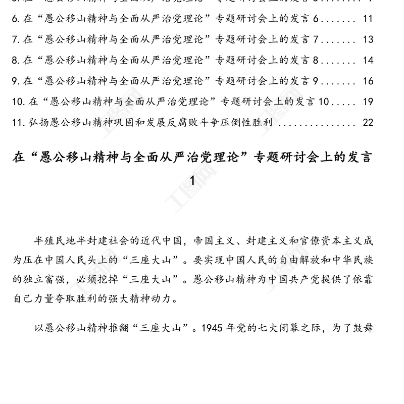 工圖網(wǎng)提供在“愚公移山精神與全面從嚴治黨理論”專題研討會上的發(fā)言材料匯編(11篇)(范文)供會員免費下載。更多精彩黨課PPT素材,盡在工圖網(wǎng)。