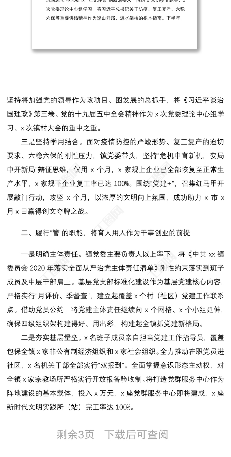 > 報(bào)告 > 鄉(xiāng)鎮(zhèn)黨委2020年度落實(shí)全面從嚴(yán)治黨主體責(zé)任、營(yíng)造良好政治生態(tài)情況報(bào)告范文.DOCX 【圖片、文字、動(dòng)畫均可編輯】