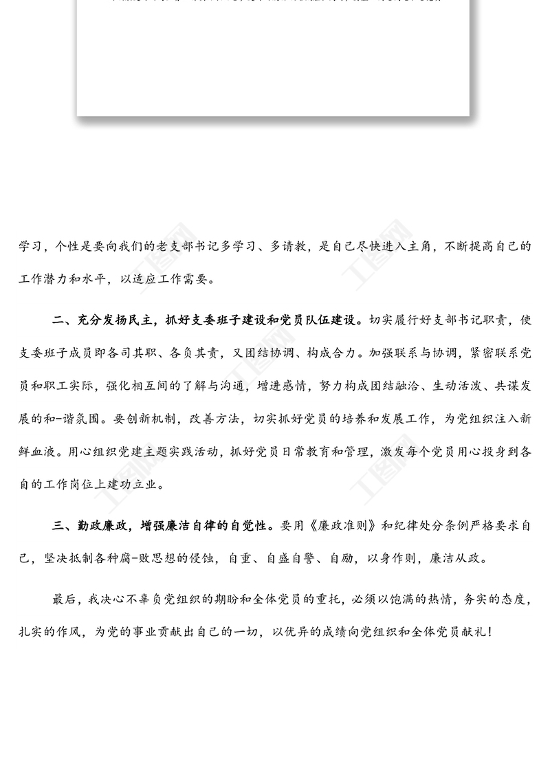 工圖網(wǎng)提供新當(dāng)選局黨支部書記任職表態(tài)發(fā)言供會(huì)員免費(fèi)下載。更多精彩黨課PPT素材,盡在工圖網(wǎng)。