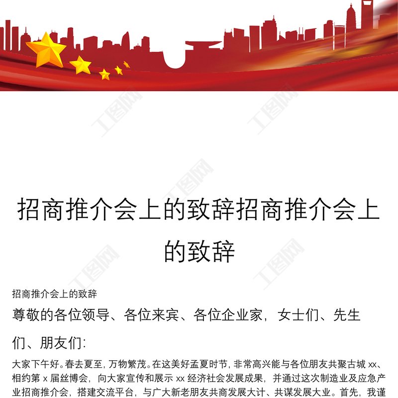 工圖網(wǎng)提供招商推介會上的致辭招商推介會上的致辭供會員免費下載。更多精彩黨課PPT素材,盡在工圖網(wǎng)。